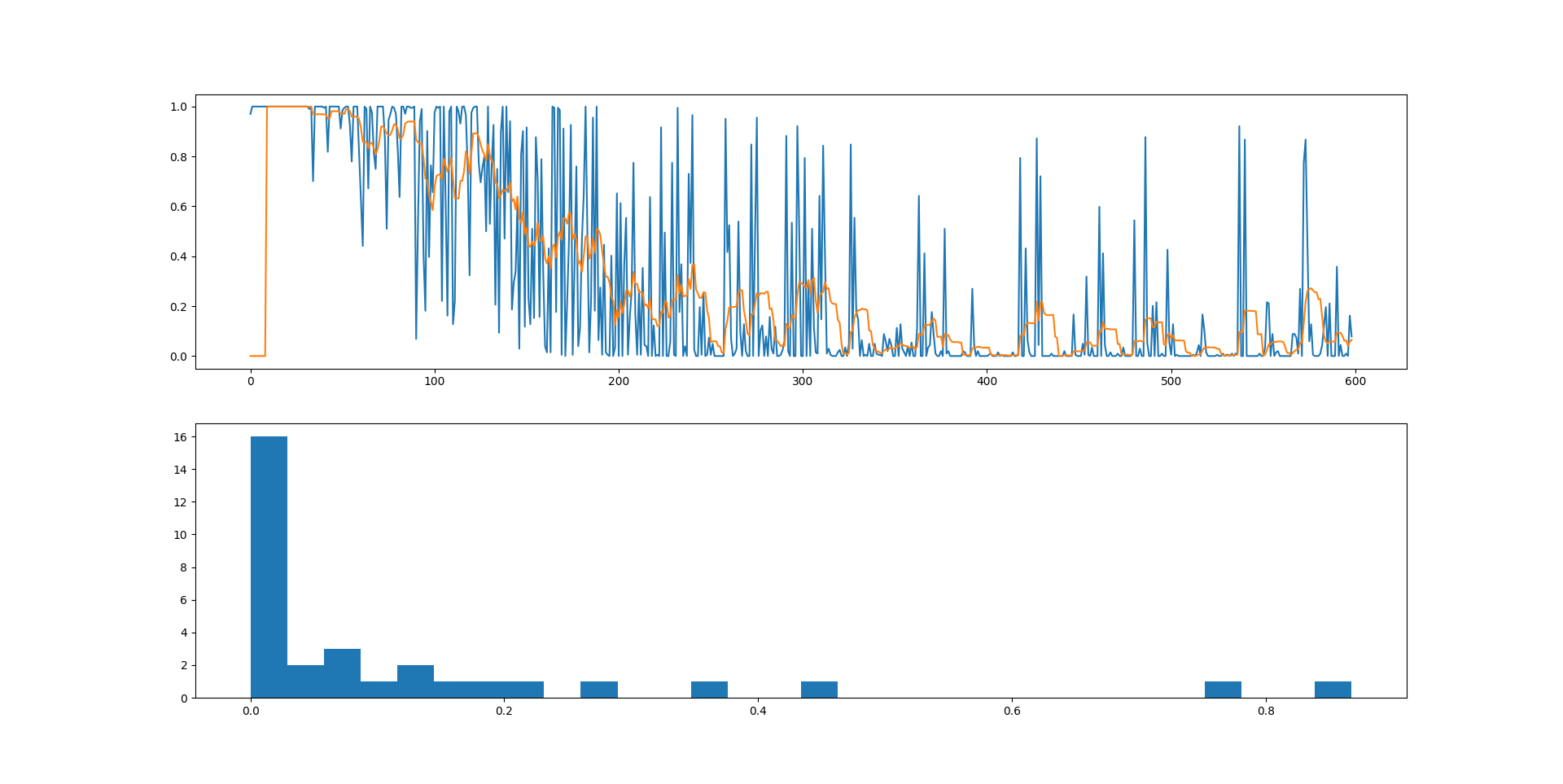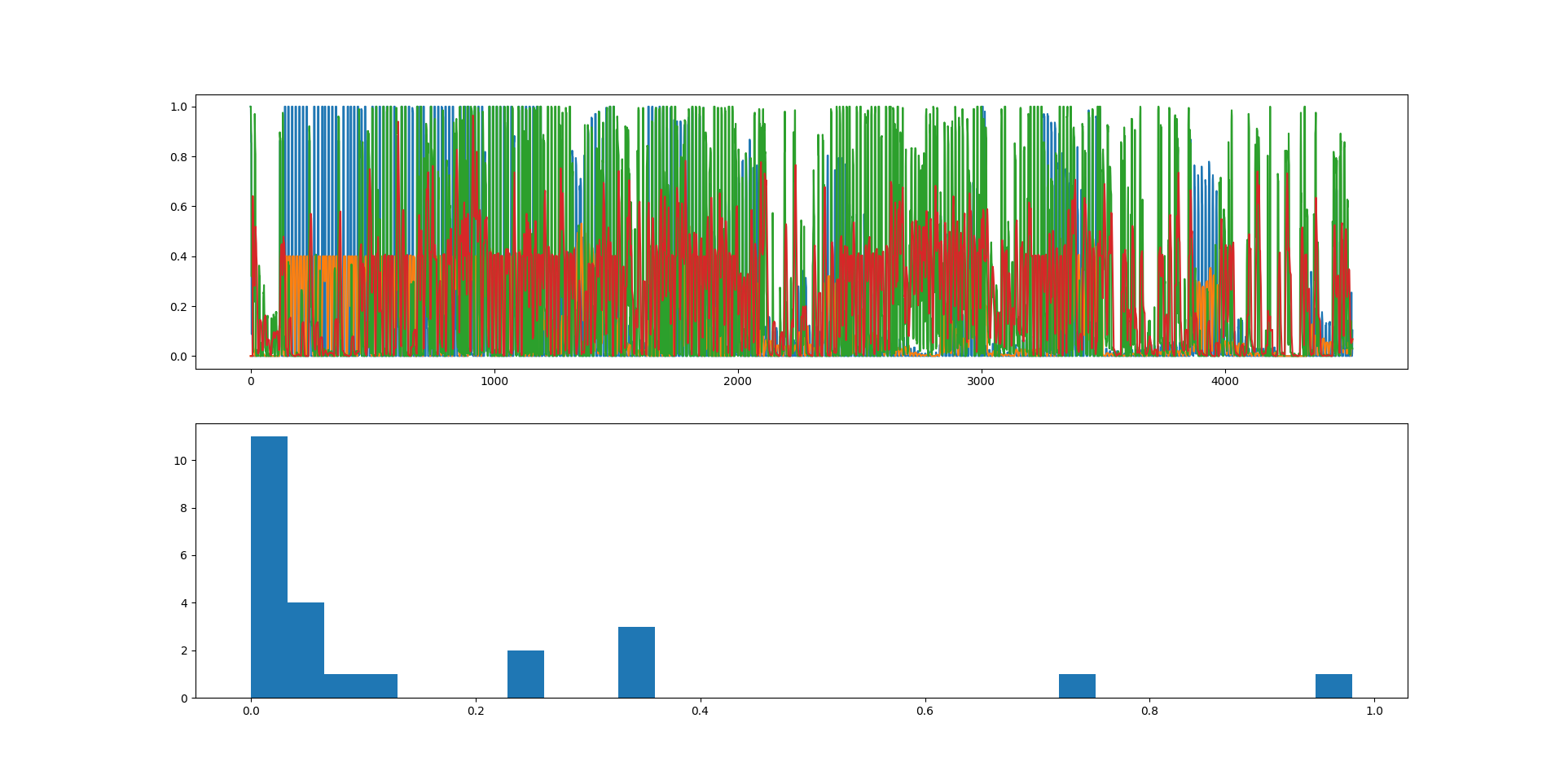 An early test of the ability of a one-layer HTM network to learn text sequences of the above form. Later analysis would suggest that the model's prediction radius grew so wide it was effectively predicting all of the possible next tokens, so while it technically was learning the sequences, it wasn't learning them in a way to successfully understand the testing examples in a productive manner. The lower the graph goes, the lower the anomaly, which means the more the model understands the input sequence. Here, there is an overwhelming number of training examples with a low anomaly, as seen in the histogram.